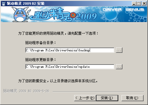 您可以自由選擇驅動精靈的安裝路徑,也可以對驅動精靈的驅動備份、下載目錄進行配置。我們建議您把備份和下載目錄設置在非操作系統分區,這樣在重新安裝操作系統時可以保證驅動文件不會丟失。