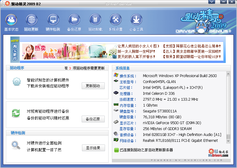 驅動精靈 2009版本現在支持32/64位Windows 2000、XP及Vista操作系統下的智能硬件檢測及驅動程序升級功能。為了確保驅動精靈在線智能檢測、升級功能可正常使用,您需要確認您的計算機具備正常的互聯網連接能力。在非聯網狀態,驅動精靈部分功能將不可用。 |