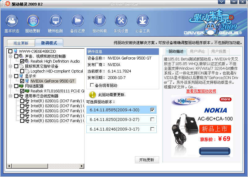 “快速更新”部分:快速更新部分所有需要安裝驅動程序的硬件設備均會被列出。您可以通過點擊硬件名稱來確認是否需要更新驅動程序。默認情況下,需要安裝驅動的硬件會被勾選。另外,我們提供了3項驅動供用戶選擇,如果新的驅動不適合您,您可以選擇較早版本的驅動。右側的功能區提供了驅動說明、驅動評論和投票功能