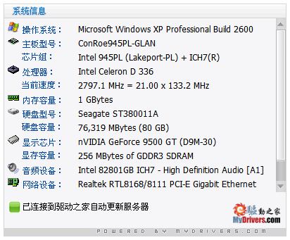 主界面右側區域是驅動精靈的新功能:硬件檢測。 它可告知您的計算機具體配置狀況,包括處理器、內存、主板、顯卡、聲卡、網卡等硬件信息一目了然。在以后的版本中此功能將會得到擴充,您可以查看更多的硬件信息,對您的硬件了如指掌。