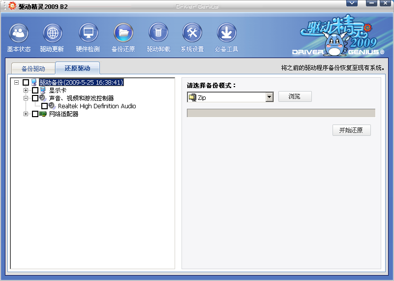 至于備份和還原功能,則是驅動精靈2008版本就提供的實用功能。您可對本機現有的驅動進行備份,在適當的時候進行還原。