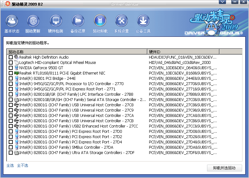 對于因錯誤安裝或其他原因導致的驅動程序殘留,我們推薦您使用驅動程序卸載功能卸載驅動程序,卸載驅動程序僅需勾選硬件名稱,然后點擊卸載所選驅動按鈕即可完成卸載工作。我們不建議一次刪除多個硬件的驅動程序。